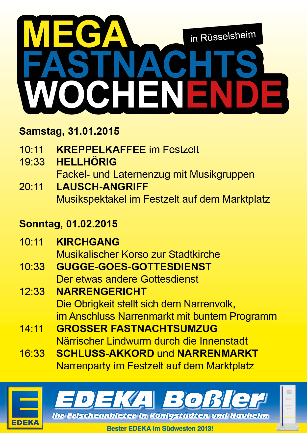 Los geht es am Samstag den 31.01.2015 mit dem „närrischen Kreppelfrühstück“ ab 10:11 Uhr, zu dem auch Kinder herzlich eingeladen sind und von der Stadt Rüsselsheim unterhalten und beschäftigt werden. Weiter geht es dann am Abend mit dem gewohnten Programm ab 19:33 Uhr. Hier starten wir den musikalischen Fackel- und Laternenumzug ab der Parkschule zum Marktplatz. Zur Teilnahme an diesem Umzug ist ausdrücklich jeder eingeladen, der eine Laterne oder Fackel sein eigen nennt und führen kann. Bei Bedarf werden Wachsfackeln für einen kleinen Unkostenbeitrag vorgehalten und für den Umzug zur Verfügung gestellt. Weiter geht es im Anschluss im Festzelt zum Lauschangriff ab 20:11 Uhr bei dem sich die teilnehmenden Musikgruppen präsentieren. Am Sonntag beginnt das närrische Treiben mit dem Kirchgang um 10:11 Uhr dem musikalischen Korso zur Stadtkirche wo um 10.33 Uhr „GUGGE-GOES-GOTTESDIENST“ stattfindet. Ab 12:33 Uhr geht es dann weiter mit dem Narrengericht, hier wird den Stadtoberen der Prozess gemacht und über ihre Tätigkeiten Gericht gehalten. Die Anklage und Verurteilung übernimmt in diesem Jahr der Großer Fastnachtrat der Siedler 11 e.V.. Um 14:11 Uhr wird mit lauten Böllerschüssen der Fastnachtsumzug gestartet und schlängelt sich dann in Richtung Innenstadt zum Festzelt. Ab ca. 16:33 Uhr erklingt, der musikalische SCHLUSSAKKORD.